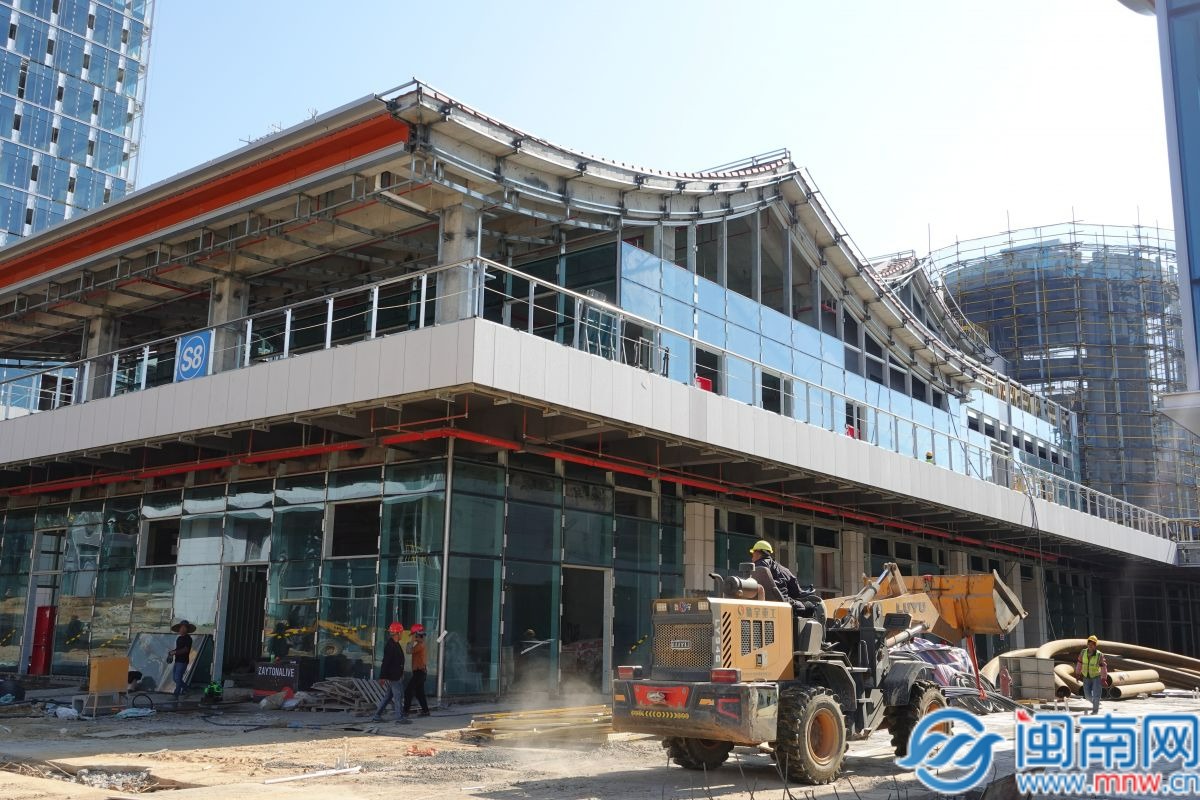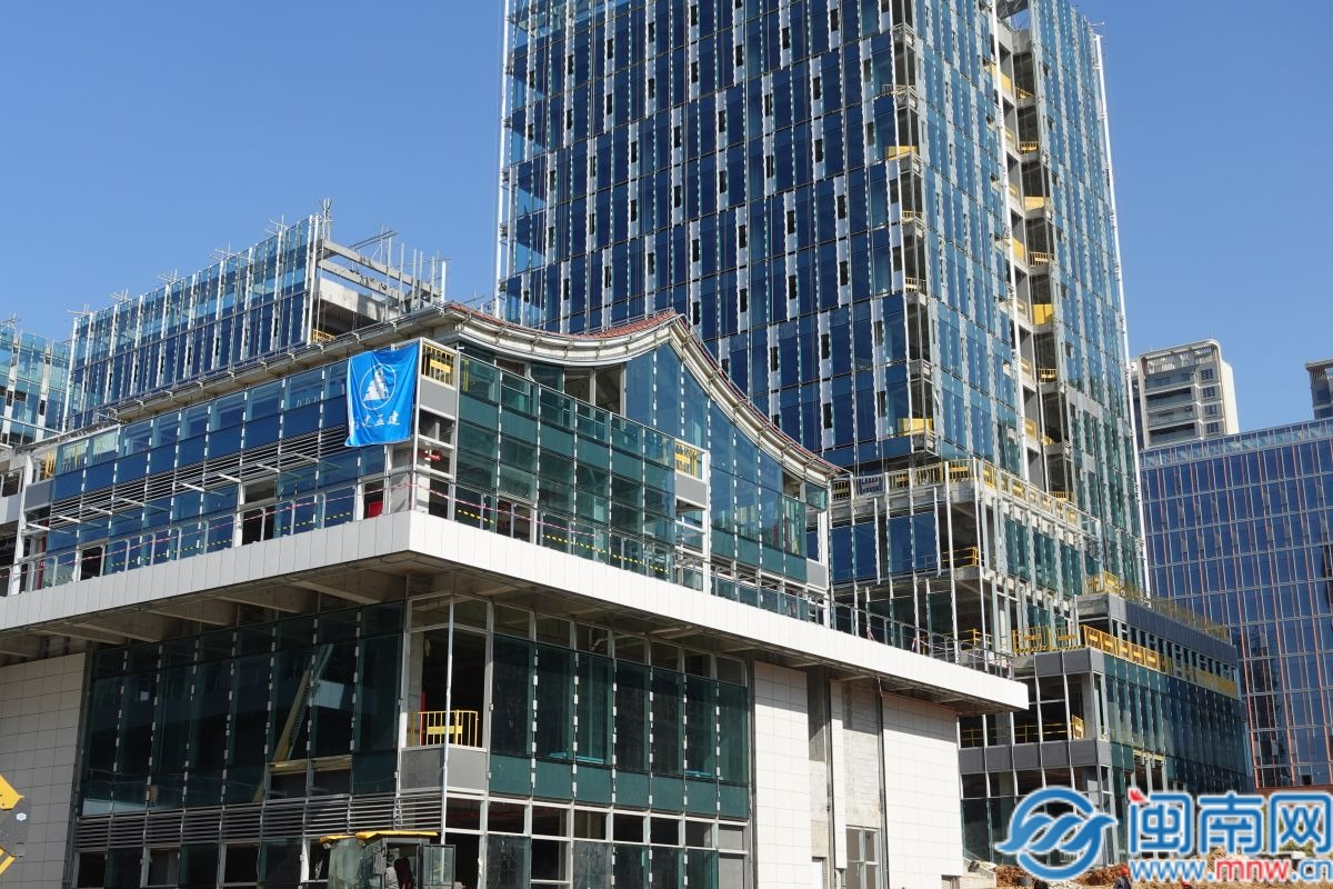 今天上午,闽南网记者走进项目建设现场看到,项目一期、二期的主体建筑已全面落架,整体外观现代感与海丝特色交织,文旅商综合体逐步显现。现场作业车辆往来穿梭,200余名施工人员分布在各作业面,或进行外立面收尾,或开展内部管线铺设,全力冲刺建设节点。