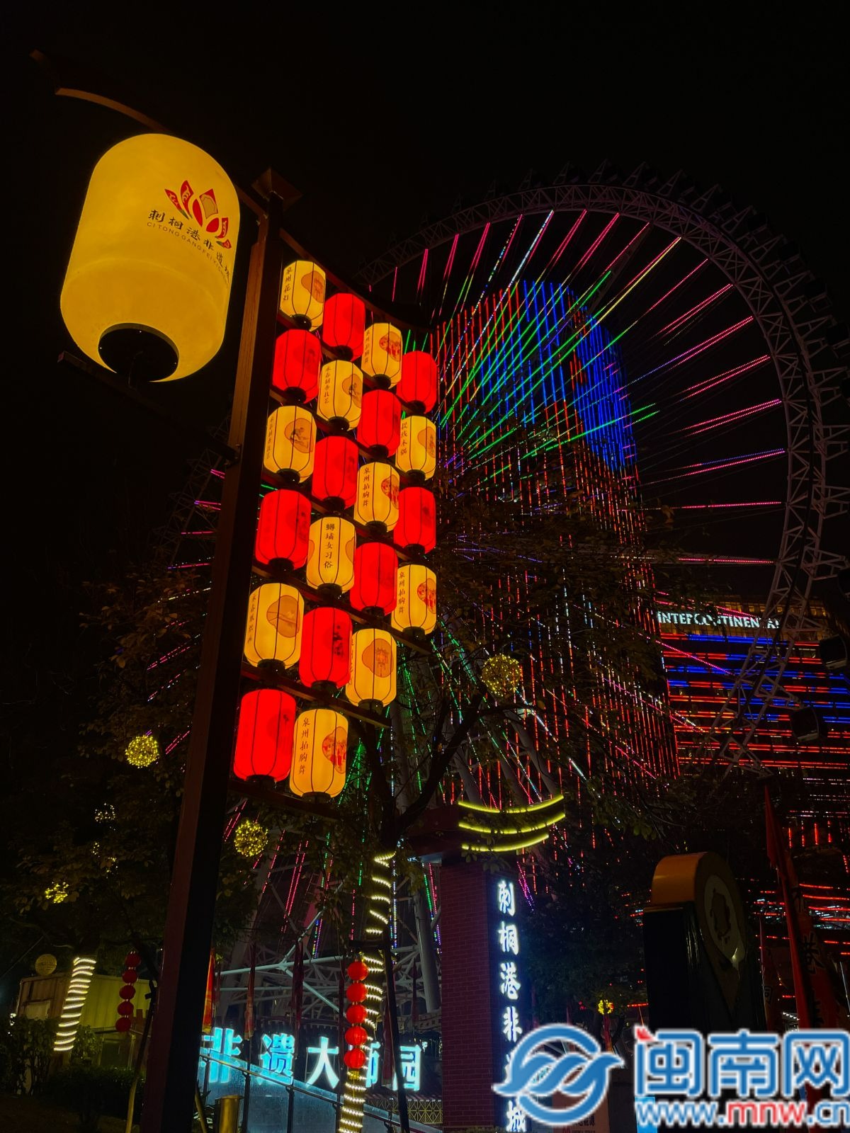 刺桐港非遗城的非遗灯巷更藏匠心,传统与创意花灯相映争艳,纸织画、锡雕、拍胸舞、蟳埔女习俗等非遗元素镌刻于灯面,让非遗的灵魂,在灯火阑珊处悄然绽放。