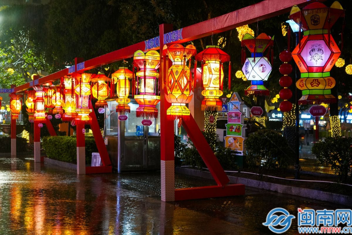 隆恩尚城至中国银行路段,62盏大中型花灯流光溢彩。尽管天公不作美,下着淅淅沥沥的雨,但广场上非遗展演仍吸引了游客的脚步,妆糕人、布袋木偶戏妙趣横生,南音婉转、印尼舞蹈灵动。