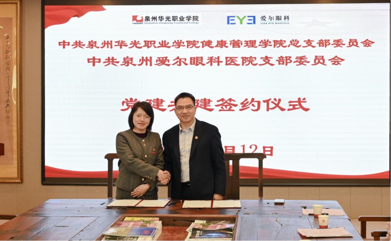 为深化医教融合,医校共建,整合双方资源,实现党建与业务同频共振,助力眼视光人才培养和校园眼健康服务落地,3月12日下午,中共泉州华光职业学院健康管理学院总支部委员会与中共泉州爱尔眼科医院支部委员会在泉州华光职业学院会议室举行党建共建签约仪式并开展主题活动。