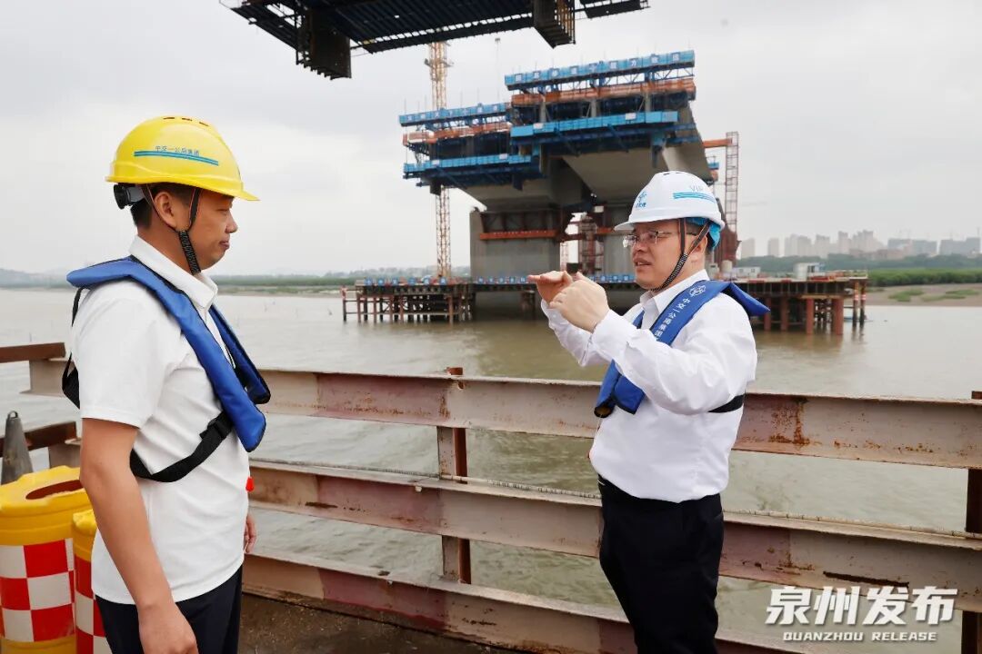 作为泉州市区跨越洛阳江的第三座现代化桥梁,金屿大桥建成后将有效缓解交通压力,为洛阳江两岸产业融合、居民往来提供便捷通道。蔡战胜来到施工现场,详细了解项目建设进展、施工工艺、安全管理等情况。他强调,要始终把为民造福作为最大政绩,紧扣群众所盼与发展所需,持续提升项目精细化管理水平,科学安排工期,动态优化工序,把高标准、严要求贯穿工程建设各环节,打造经得起历史和实践检验的精品工程、民心工程。要坚守安全底线,常态化开展安全隐患排查整治,综合运用“五想五不干”安全作业、“班组早会一分钟”等机制,在确保安全、规范的前提下全力推动项目早建成、早投用、早惠民。各级各有关部门要强化责任担当,统筹做好要素保障各项工作,为项目加快推进提供有力支撑。