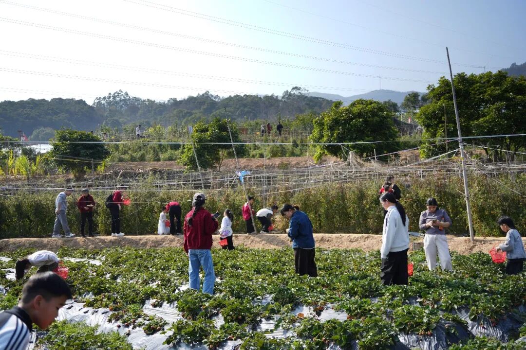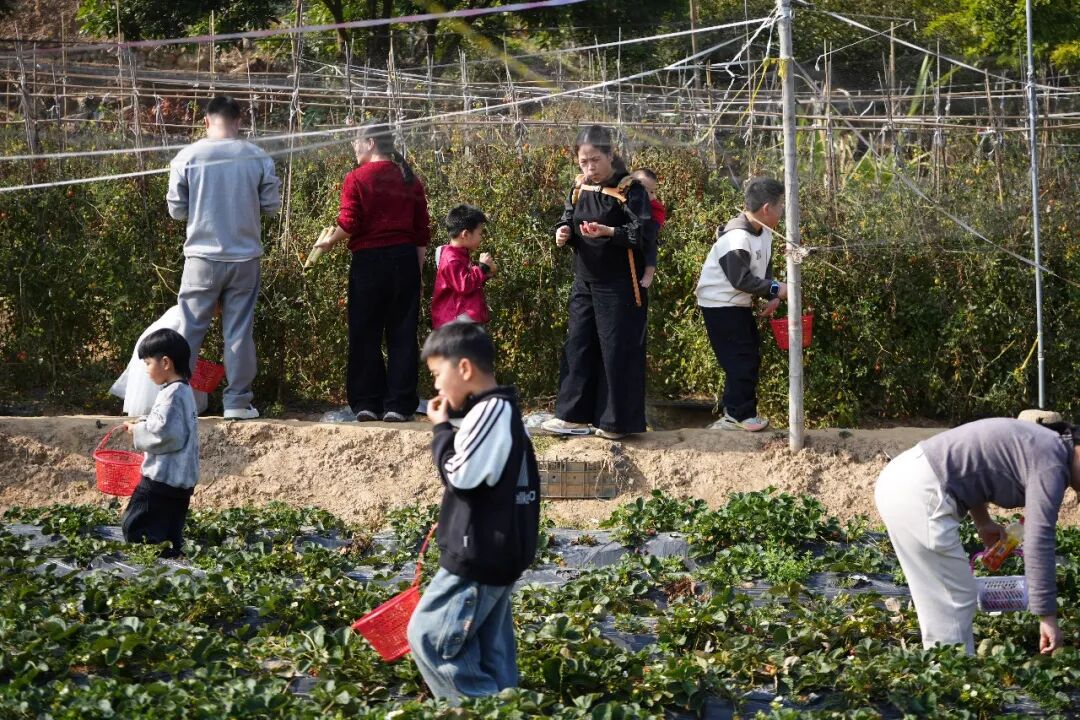 曾经的甘蔗林,如今仍是游客眼中的“香饽饽”。大人小孩撸起袖子钻进蔗林,亲手采摘、称重、品尝,田间地头回荡着欢声笑语。不远处的采摘园里更是热闹非凡——红彤彤的草莓、一串串饱满的圣女果、挂满枝头的沃柑,吸引着游客们提着果篮穿梭其间,现摘现吃,酸甜多汁的口感让大人小孩都赞不绝口。