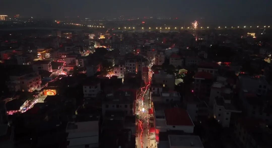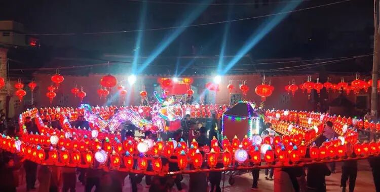 夜色渐浓,五彩斑斓的廻龙灯流光溢彩、熠熠生辉,红、黄、蓝、绿、金等各色灯彩交相闪烁,一盏盏精巧的宫灯绵延成阵,与路边高高悬挂的大红灯笼相互映衬。每当游灯队伍经过时,家家户户纷纷在门前点燃鞭炮、燃放烟花,噼啪声响彻街巷,绚烂烟火腾空而起,每一声爆竹、每一束火光,都承载着大家对风调雨顺、阖家安康、日子越过越红火的美好期盼。