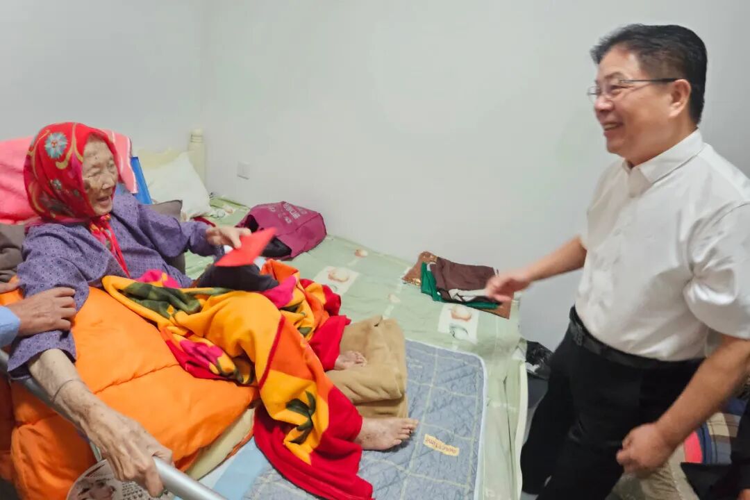 市委常委、市政府常务副市长黄景春前往台商投资区洛阳镇,亲切慰问百岁老人张尝,为她送去节日的诚挚问候与美好祝福。黄景春与老人及其家属亲切交谈,他紧紧握住老人的手,细致入微地询问其日常饮食、起居作息和身体健康状况,耐心倾听记录老人的实际生活需求,并叮嘱老人家要注意防寒保暖和居家防滑,保持规律的作息与乐观开朗的心态,安享晚年。