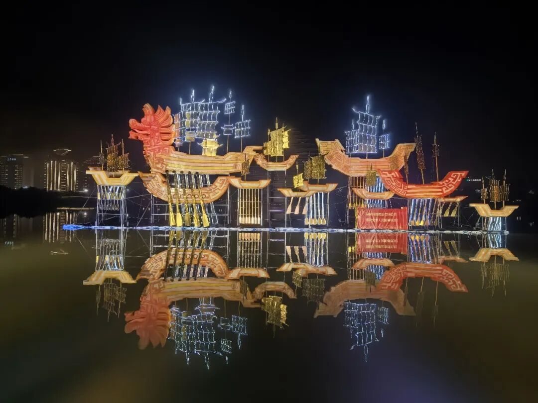 水上主题座灯以“郑和下西洋”为灵感,以舰队主舰为视觉焦点,周边帆影重重,通过动态光影技术,在波光粼粼的湖面上营造出“千帆竞发、百舸争流”的壮阔景象。陆上主题座灯则以马年生肖文化为核心,鎏金骏马踏浪腾云,周身祥荷、金元宝等传统吉祥元素环绕,奔腾气势中尽显吉庆豪迈的东方气派,成为市民拍照打卡的热门背景。