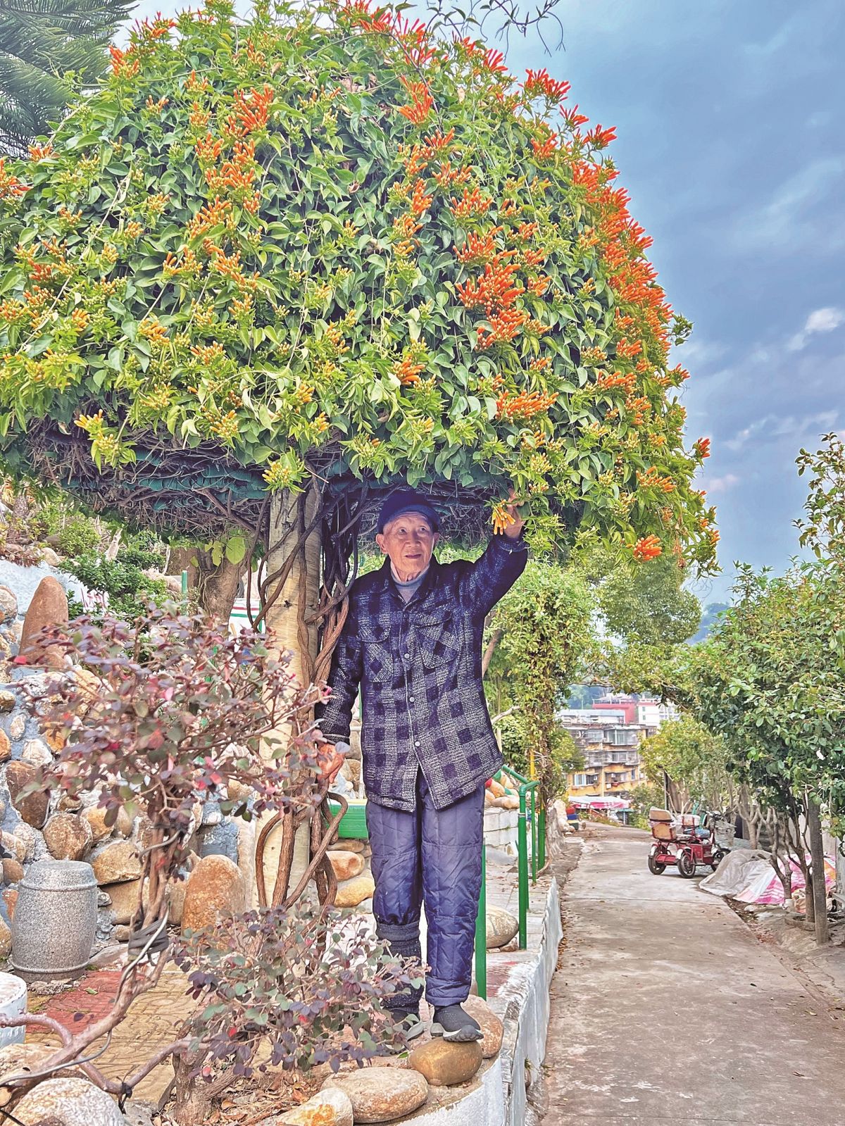 古有愚公移山,今有93岁老人自建铁路广播山“微公园”。春日里,踏进永安燕东街道翔南分巷,一路沿阶而上,只见炮仗花顺着藤蔓开出一朵朵橙黄色的小花,像一串串鞭炮热烈喜庆;榕树冒出嫩绿的新芽,红艳艳的三角梅正绚烂绽放,一株天堂鸟正迎着清风舒展身姿,四季桂枝叶繁茂,淡黄色的小花瓣香气怡人,这一方小小天地里,藏着一位铁路老兵——刘敏捷40余年的心血与热爱。