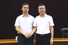 朱启平(左)和张永宁(右)握手 (记者 颜华杰)