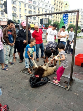 昨日,记者走访鸳鸯池公园,在公园门口前一处烧烤摊看到,小贩正在屠宰一只活黑羊,不少群众围观,其中还有三四名小孩。