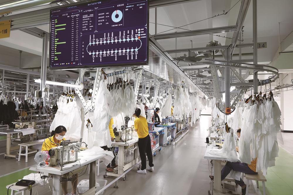 吊挂系统、电脑自动裁剪机、自动拉布机……走进石狮卡宾服饰(中国)有限公司的生产车间,映入眼帘的是一整套智能化服装生产流水线。这里曾生产过庆祝中华人民共和国成立70周年群众游行队伍服装、2022年北京冬奥会开幕式护旗手方阵服装;也曾临危受命,于2020年新冠肺炎疫情暴发之际迅速转产医用防护服,日产万件以上,在最短时间内为一线防疫工作提供物资保障。“得益于智能化改造,企业降低了生产成本、缓解用工压力,同时生产效率也大大提升。”卡宾公司福建区负责人施雅玲介绍道。