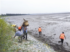 蚶江镇古渡口段环卫工人清理整治海漂垃圾现场