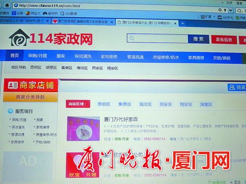 上个月,郑锦萍在上网时无意发现了两家网站——“号百家政”和“114家政网”,这两家网站看起来很正规,网址里还含有315和114,让人觉得具有官方背景。不仅如此,厦门200多家家政公司的具体业务信息都在这两个网站上有详细体现。她在这两家网站上都查到了自家公司的详细信息,起初还以为是公司负责企划的同事将这些信息发布在上面的,后来经过查询才发现并非如此。