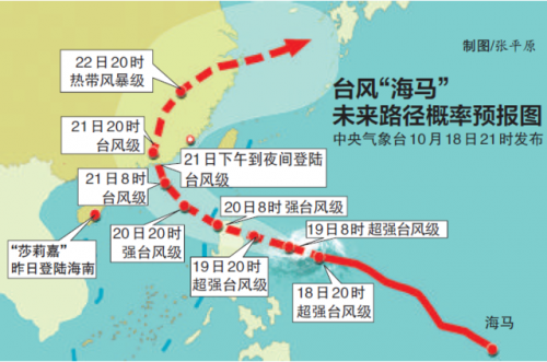 台风“海马”目前还位于菲律宾以东洋面,预计将于20日中午前后移入南海东北部海域,之后逐渐向广东东部到福建南部一带沿海靠近,并有可能于21日下午到夜间在这一带沿海登陆,最大的可能是在广东东部沿海登陆。