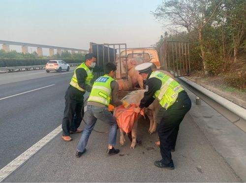 经了解,当天,驾驶员李某驾驶运载了几头生猪从漳州角美前往泉州晋江。行驶至该路段时,车内的一头生猪突然“越狱”,翻出了车厢。“一头猪要千把块,要是没有你们的帮助,不知道怎么才能抓回去。”事后,李某不停对民警和养护人员表示感谢。