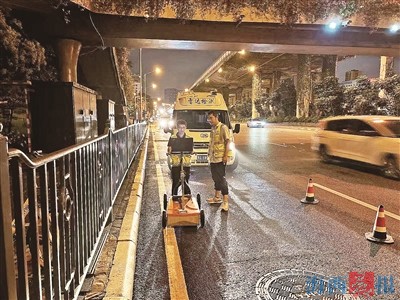 在湖滨南路,工作人员通过雷达探测车给道路拍“CT”,初步探测地下有无空洞等情况。由于道路下情况复杂,各类管线密集,可能会影响雷达探测。在车载式雷达发现异常情况后,工作人员还要再用手推雷达进行检查。手推雷达有着强大的“透视眼”,能穿透厚厚的路面,精准圈定病害范围。