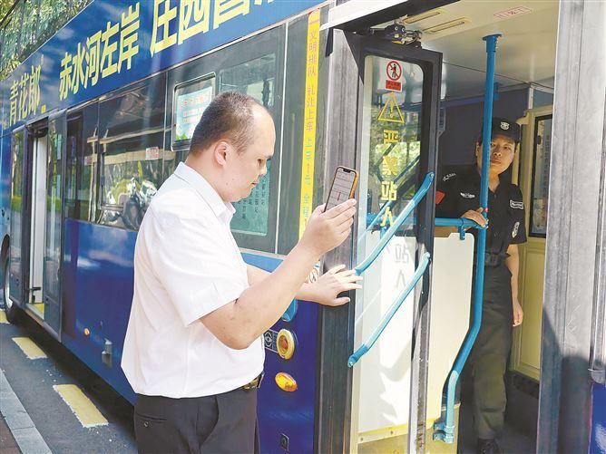 视弱人士庄先生在公交视弱辅助系统的帮助下乘车。