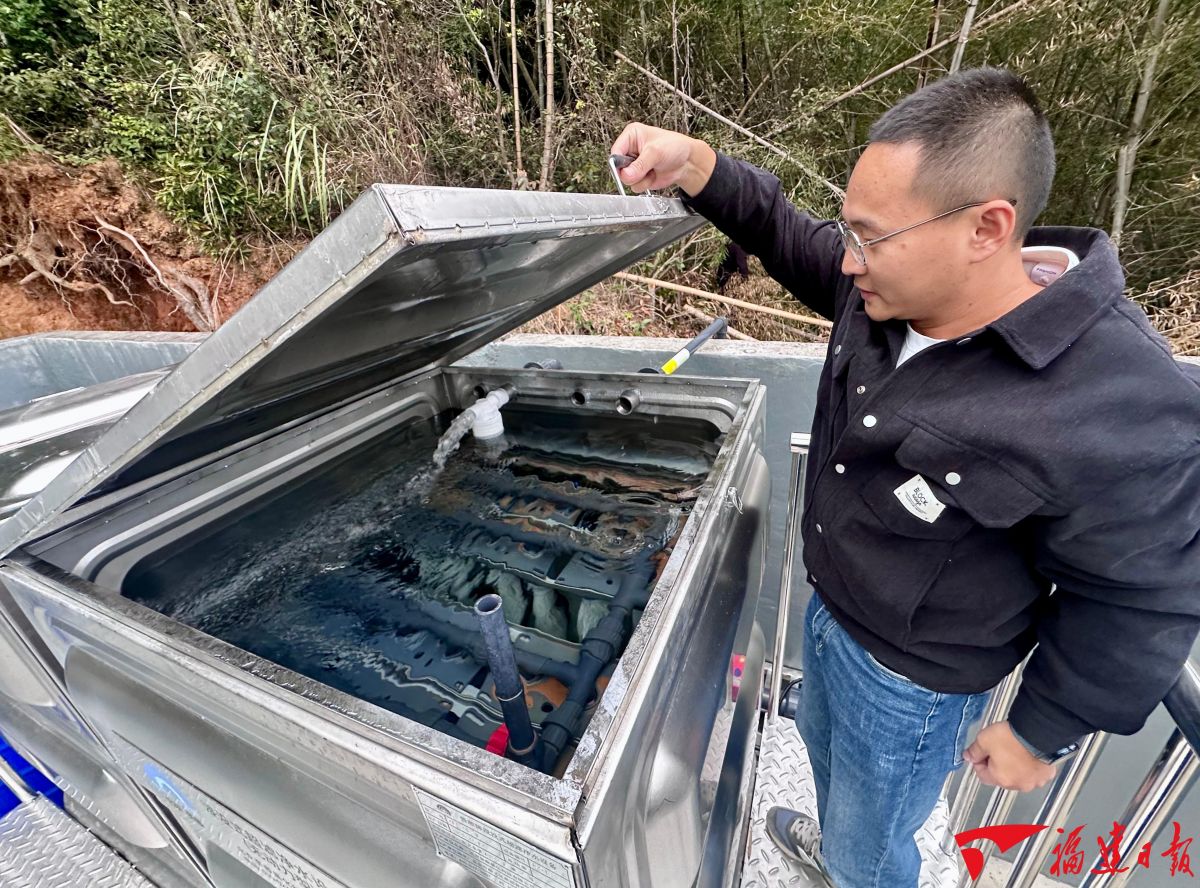 在溪柄镇田坂村单村供水点,记者见到了福建光宇环保科技有限公司的刘凯。作为第三方专业管护人员,他在完成了消毒药剂投加、净化处理设施维护后,还用随身携带的设备,对出厂水pH值、浊度、余氯、色度等指标进行检测。完成后,他用专业客户端在当地打卡,将现场图片与检测数据上传到公司平台、省级平台。