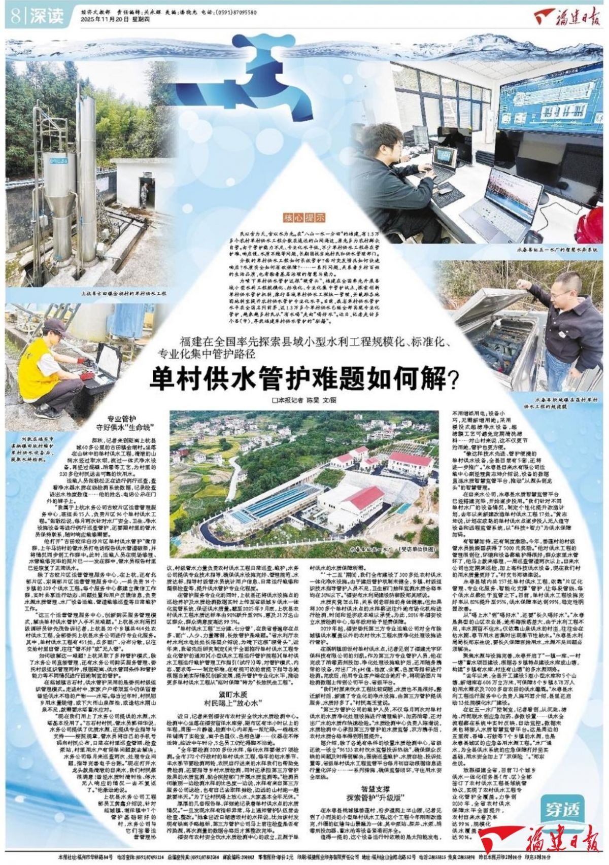 为啃下单村供水管护这根“硬骨头”,福建在全国率先开展县域小型水利工程规模化、标准化、专业化集中管护试点,探索创新单村供水管护机制,推行县域单村供水工程统一管理,并鼓励各地因地制宜提升农村供水管护专业化水平。目前,我省单村供水管护水平在全国名列前茅,这1.3万多个单村供水已经全部实现专业化管护,越来越多村民从“有水喝”走向“喝好水”。近日,记者走访多个县(市),寻找福建单村供水管护的“秘籍”。