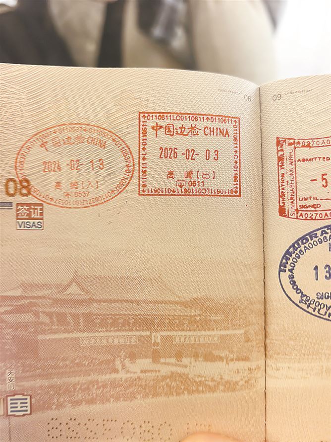 旅客展示标有“高崎”字样的边检验讫章。