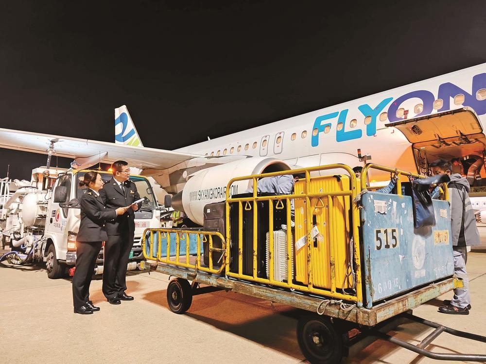 厦门机场海关关员检查西哈努克港飞抵厦门航班搭载的行李物品。 罗俊毅 摄