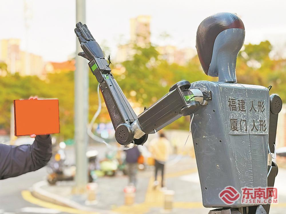 日前,我省首台“人形交通辅助机器人”完成首次封闭环境多场景测试。福建日报记者 傅韬旭 摄