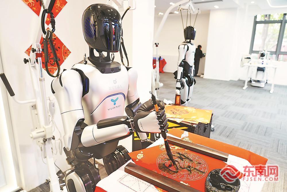 在元启创新机器人展示中心里,“远征”在写 “福”字。福建日报见习记者吴函晓 摄