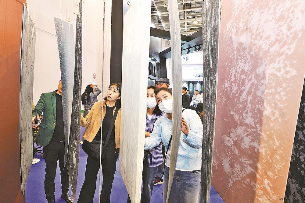 观众在“天然石材品种展”展区观赏展品。