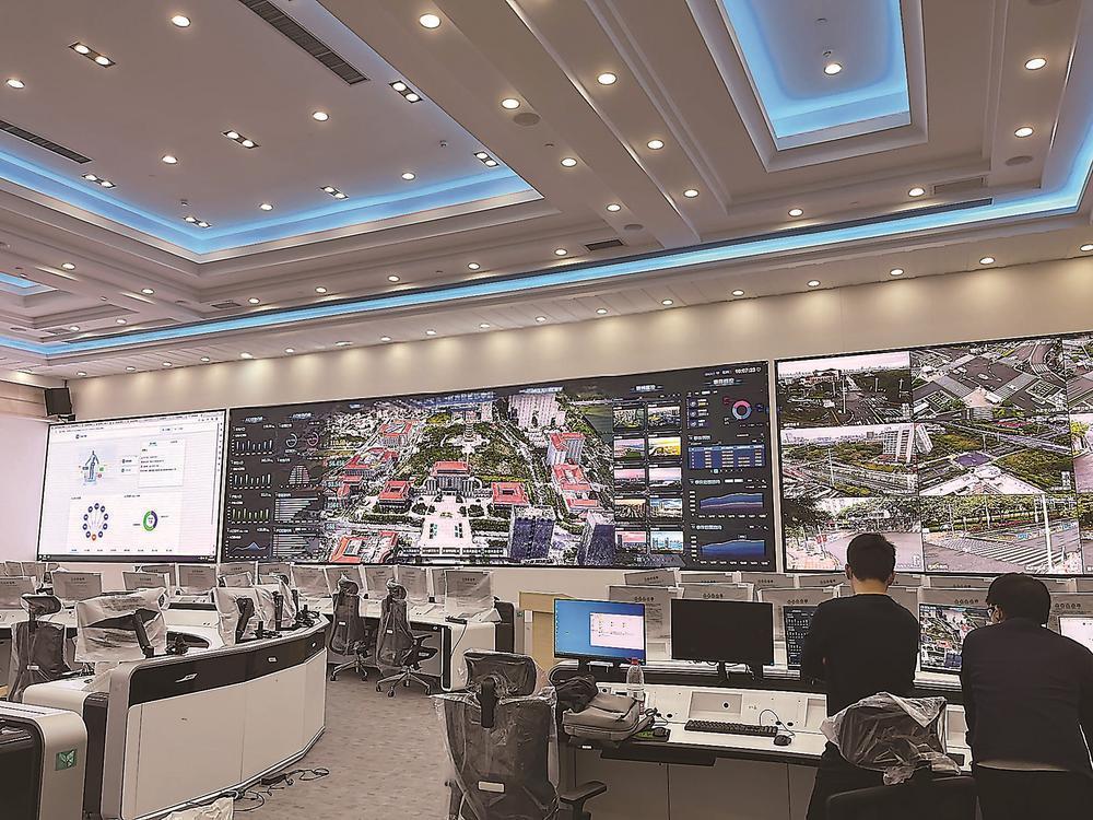在位于集美区的社会综合治理智慧大屏前,工作人员正快速查看基于三维建筑底座的各类空间信息,快速作出指挥决策。(受访者供图)
