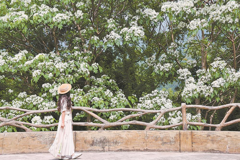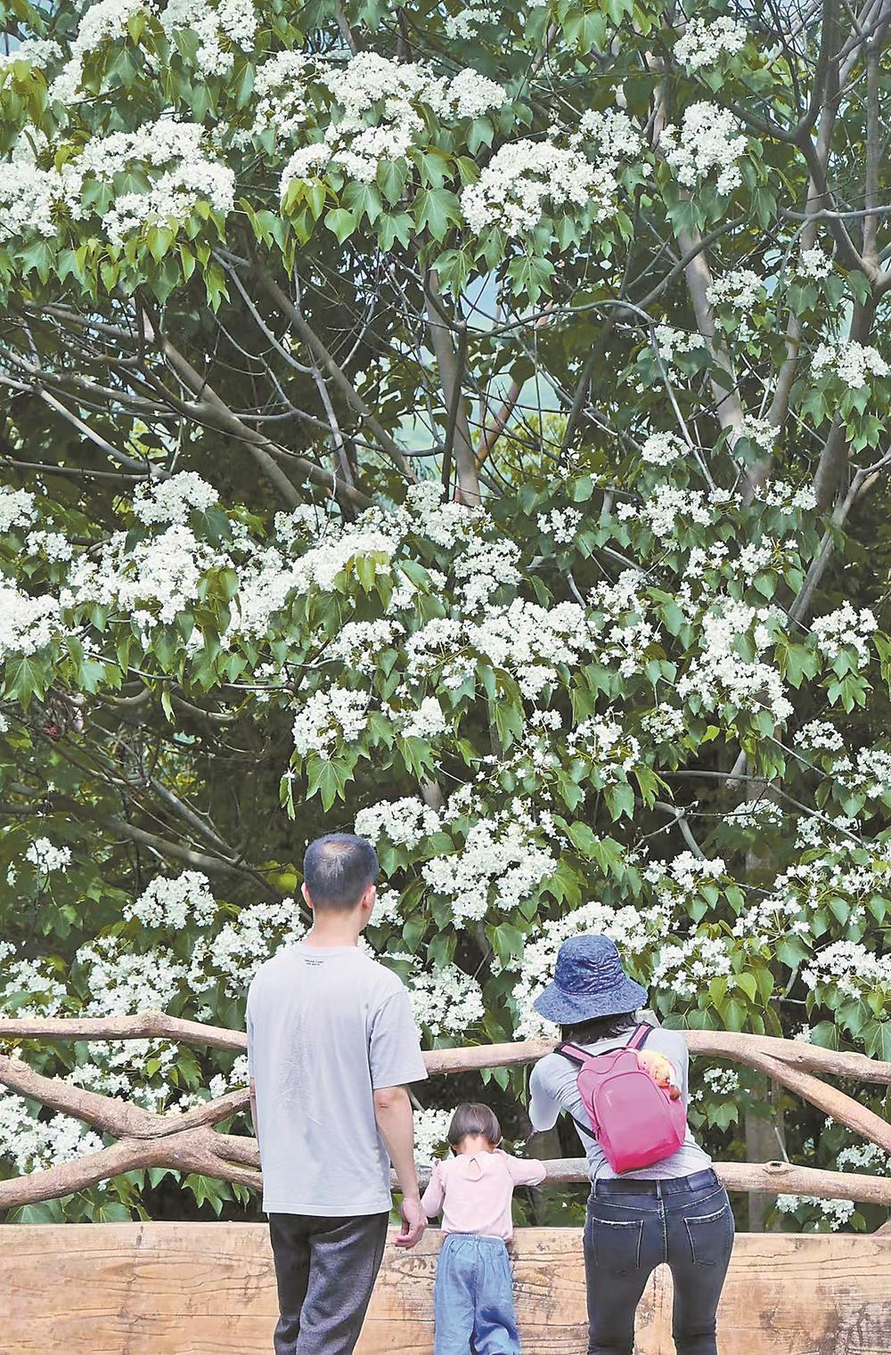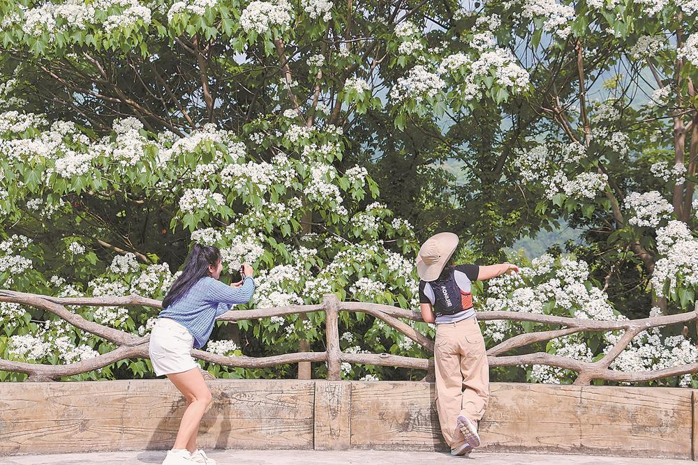 近日,厦门市海沧区天竺山4万株桐花迎来盛花期,漫山桐花如云似雪,洁白的花朵缀满枝头,与翠绿山林相映成趣,吸引众多市民游客前来踏青赏景。图为20日,游客在天竺山观赏盛放的桐花。