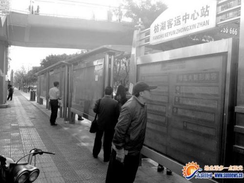 枋湖客运中心过路站的公交站牌。记者 雷妤 摄