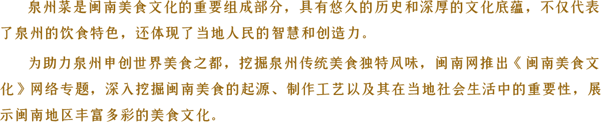 靠海吃海,泉州绵延541公里的海岸线上,贮藏了数量庞大的食材。爱吃善吃的泉州人将大海的馈赠制作成一道道特色美食。